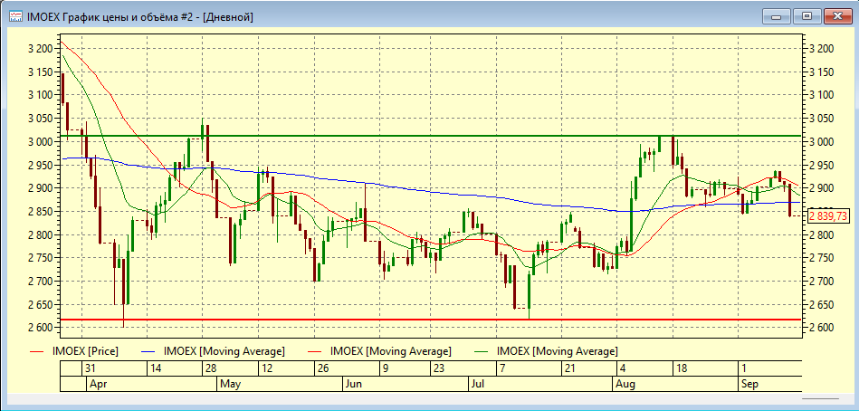 Акции. Индекс Московской биржи продолжает держаться в канале 2600 - 3000 п. Закрытие недели прошло ниже его открытия, пока наверно стоит ждать продолжение снижения.