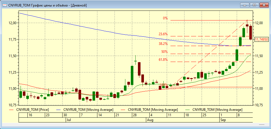 Валюта. Пара CNYRUB в течении месяца поднялась на 10%. Сейчас технически вероятна коррекция к 11,4.